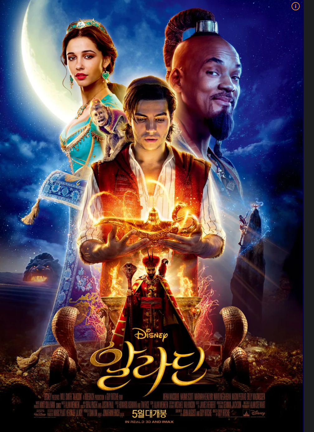 1992년 애니메이션으로 첫 선을 보인 ‘알라딘’은 생동감 넘치는 캐릭터, 재치 있는 대사, 그리고 귀에 익은 음악들로 디즈니의 대표작 중 하나로 자리매김했다. 실사화 버전은 이러한 원작의 정서를 고스란히 이어가되, 보다 현대적인 감성으로 재해석된 점이 특징이다. 예를 들어 애니메이션에서는 자스민이 상대적으로 수동적인 역할이었다면, 실사판에서는 정치적 야망과 독립성을 강조해 더욱 입체적인 캐릭터로 재구성되었다. 또한 지니의 캐릭터도 애니메이션에서보다 현실적인 배경과 감정을 부여받아 인간적인 모습이 강해졌으며, 마지막에는 인간이 되어 사랑을 이루는 결말로 확장되었다. 무대 디자인과 의상, CG 기술 또한 현저하게 발전해 마법의 양탄자와 동굴, 왕궁의 모습이 실제로 존재하는 듯한 현실감을 주었으며, 뮤지컬 넘버의 연출은 관객에게 시각적 즐거움을 극대화시켰다. 하지만 일부 관객은 실사화에서 오는 생동감 부족을 지적하기도 했고, 애니메이션 특유의 유쾌함과 과장이 실사에서는 다소 약화됐다는 의견도 있었다. 그럼에도 불구하고 전체적으로 보면 실사판 '알라딘'은 원작을 훼손하지 않으면서도 새로운 메시지와 현대적 감각을 담아내는 데 성공했다.